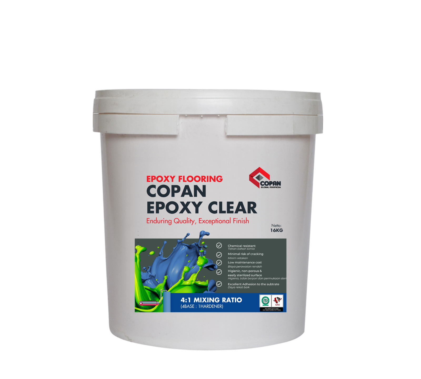 Copan Epoxy Clear adalah cat pelapis transparan berbahan dasar resin epoxy yang dirancang untuk memberikan perlindungan maksimal pada permukaan lantai maupun beton. Produk ini menciptakan lapisan bening yang keras, mengkilap, dan tahan lama, sehingga menjaga permukaan tetap bersih, kuat, serta mudah dirawat. Dengan formula khusus, Copan Epoxy Clear sangat ideal digunakan pada area yang membutuhkan ketahanan tinggi terhadap gesekan, bahan kimia, maupun beban berat.